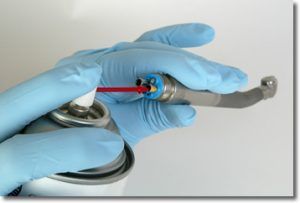 Note: Using a spray oil has become less popular because of perceived mess and wastage. Many offices are moving to dropper style applicators to oil the handpiece. Use of a dropper makes the next step, running out the excess oil critical, because the droplets will not be delivered to the bearings without being propelled by pressurized air. If you prefer a dropper, apply 2-3 good size drops to the drive air hole and immediately run the handpiece.